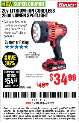 20V LITHIUM-ION CORDLESS 2500 LUMEN SPOTLIGHT Lot No. 56526 Expired: 3/1/20 - $34.99 Coupon Code: '41131070'