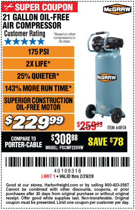 21 GALLON, 1.5 HP, 175 PSI VERTICAL OIL-LUBE Lot No. 64858 Expired: 2/29/20 - $229.99 Coupon Code: '40109316'