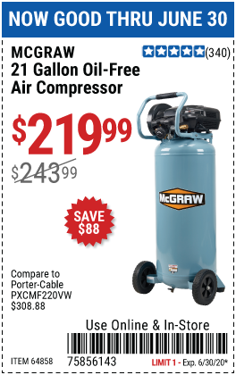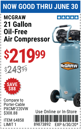 21 GALLON, 1.5 HP, 175 PSI VERTICAL OIL-LUBE Lot No. 64858 Expired: 6/30/20 - $219.99 Coupon Code: '75856143'