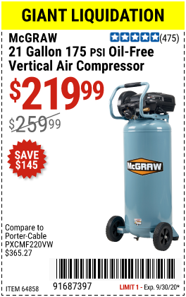 21 GALLON, 1.5 HP, 175 PSI VERTICAL OIL-LUBE Lot No. 64858 Expired: 9/30/20 - $219.99 Coupon Code: '91720557'