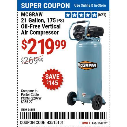 21 GALLON, 1.5 HP, 175 PSI VERTICAL OIL-LUBE Lot No. 64858 Expired: 1/29/21 - $219.99 Coupon Code: '43515191'