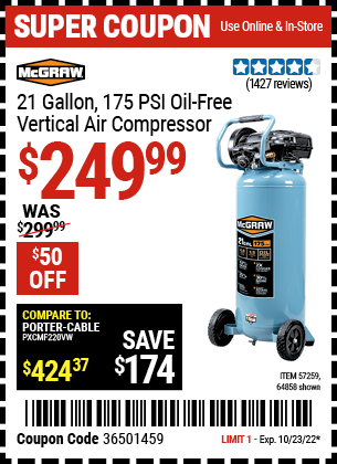 21 GALLON, 1.5 HP, 175 PSI VERTICAL OIL-LUBE Lot No. 64858 Expired: 10/23/22 - $249.99 Coupon Code: '36501459'