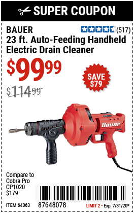23 FT. AUTO-FEEDING HANDHELD ELEXTRIC DRAIN CLEANER Lot No. 64063 Expired: 7/15/20 - $99.99 Coupon Code: '71161484'