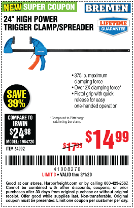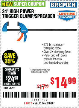 24" HIGH POWER TRIGGER CLAMP/SPREADER - BREMEN Lot No. 64992 Expired: 3/1/20 - $14.99 Coupon Code: '21140892'