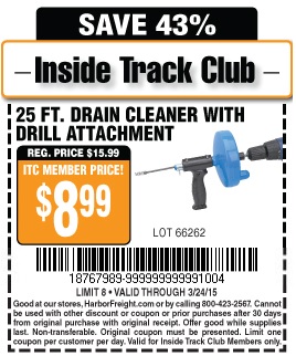 ITC 25 FT. DRAIN CLEANER WITH DRILL ATTACHMENT Lot No. 66262 Expired: 3/24/15 - $8.99 Coupon Code: '18767989'