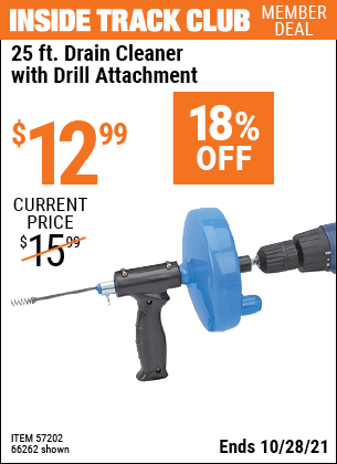 ITC 25 FT. DRAIN CLEANER WITH DRILL ATTACHMENT Lot No. 66262 Expired: 10/28/21 - $12.99 Coupon Code: 'n/a'