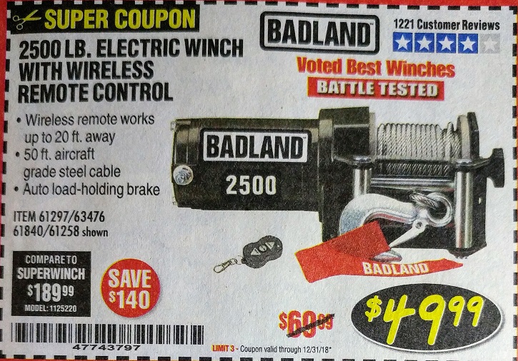 2500 LB. ELECTRIC WINCH Lot No. 61297 Expired: 12/31/18 - $49.99 Coupon Code: '47743797'