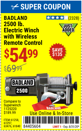 2500 LB. ELECTRIC WINCH Lot No. 61297 Expired: 8/31/20 - $54.99 Coupon Code: '84405604'