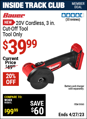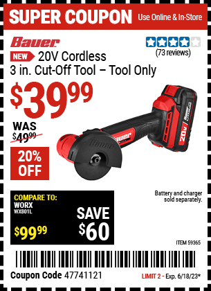 29V CORDLESS, 3 IN. CUT-OFF TOOL TOOL ONLY Lot No. 59365 Expired: 6/18/23 - $39.99 Coupon Code: '47741121'