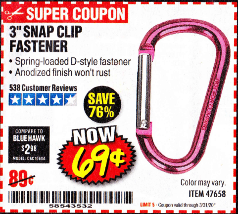 3" SNAP CLIP FASTENER Lot No. 47658 Expired: 3/31/20 - $0.69 Coupon Code: '58543532'