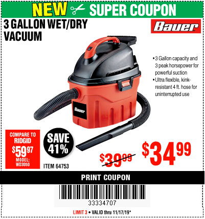 3 GALLON WET/DRY VACUUM Lot No. 64753 Expired: 11/17/19 - $34.99 Coupon Code: '33334707'