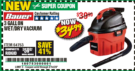 3 GALLON WET/DRY VACUUM Lot No. 64753 Expired: 3/14/20 - $34.99 Coupon Code: '18075300'