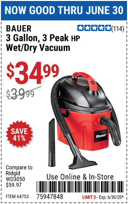 3 GALLON WET/DRY VACUUM Lot No. 64753 Expired: 6/30/20 - $34.99 Coupon Code: '75947848'