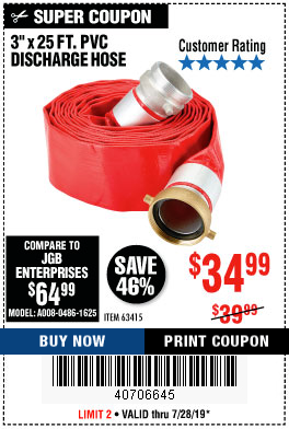 3 IN. X 25 FT. PVC DISCHARGE HOSE Lot No. 63415 Expired: 7/28/19 - $34.99 Coupon Code: '40706645'