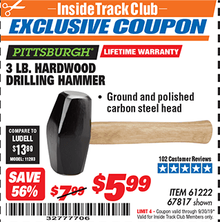 ITC 3 LB. HARDWOOD DRILLING HAMMER Lot No. 61222/67817 Expired: 4/30/18 - $5.99 Coupon Code: '12958000'