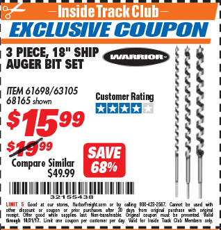 ITC 3 PIECE, 18" SHIP AUGER BIT SET Lot No. 61698/63105/68165 Expired: 8/31/18 - $15.99 Coupon Code: '25412261'