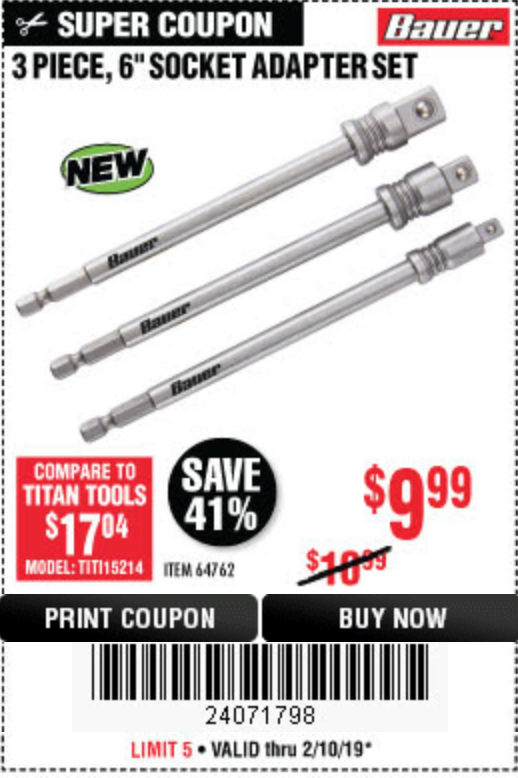 3 PIECE, 6" SOCKET ADAPTER SET Lot No. 64762 Expired: 3/31/19 - $9.99 Coupon Code: '50967873'