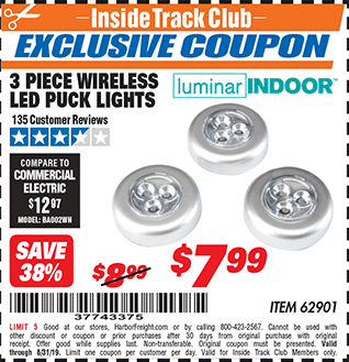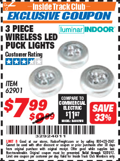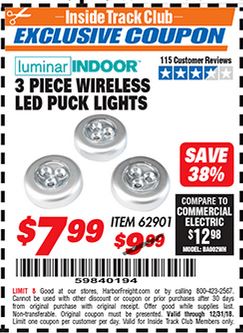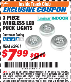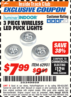 ITC 3 PIECE WIRELESS LED PUCK LIGHTS Lot No. 98372 Expired: 6/30/15 - $9.99 Coupon Code: '89620507'