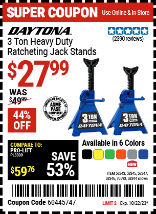 3 TON HEAVY DUTY RATCHETING JACK STANDS Lot No. 58343/58344/58345/58346/58347 Expired: 10/22/23 - $27.99 Coupon Code: '60445747'