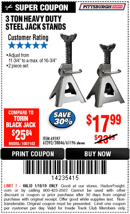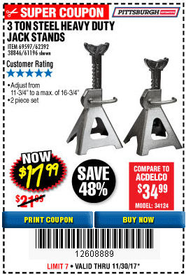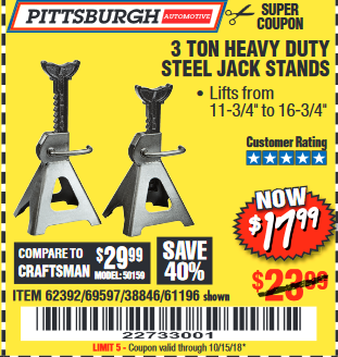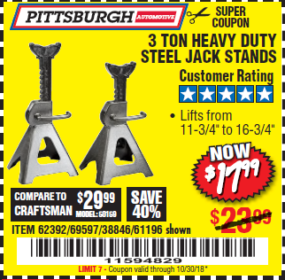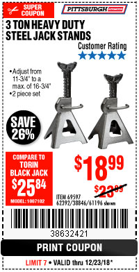 ITC 3 TON HEAVY DUTY STEEL JACK STANDS Lot No. 61196/62392/38846/69597 Expired: 3/8/18 - $17.99 Coupon Code: '11477873'