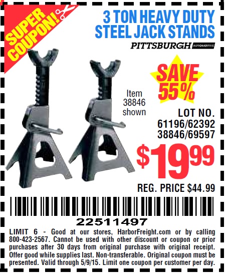 3 TON HEAVY DUTY STEEL JACK STANDS Lot No. 61196/62392/38846/69597 Expired: 4/21/15 - $19.99 Coupon Code: '83404111'