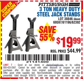 3 TON HEAVY DUTY STEEL JACK STANDS Lot No. 61196/62392/38846/69597 Expired: 6/30/19 - $17.99 Coupon Code: '70259621'