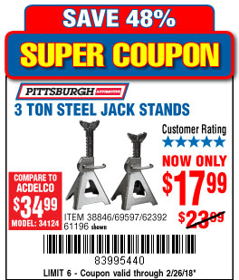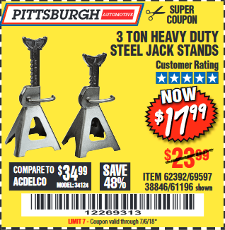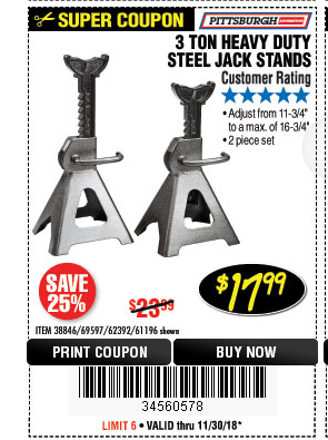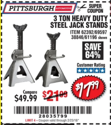 3 TON HEAVY DUTY STEEL JACK STANDS Lot No. 61196/62392/38846/69597 Expired: 3/18/18 - $17.99 Coupon Code: '86253635'