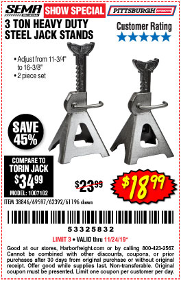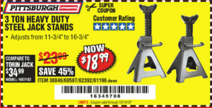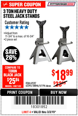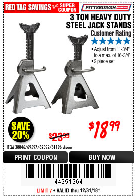 3 TON HEAVY DUTY STEEL JACK STANDS Lot No. 61196/62392/38846/69597 Expired: 3/3/19 - $18.99 Coupon Code: '18301852'