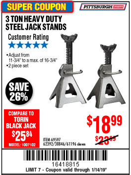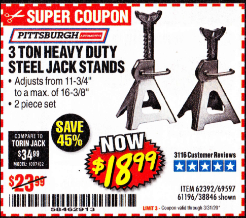 3 TON HEAVY DUTY STEEL JACK STANDS Lot No. 61196/62392/38846/69597 Expired: 1/21/20 - $18.99 Coupon Code: '31395382'