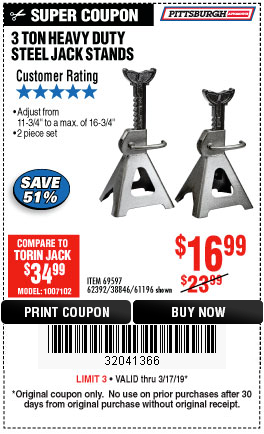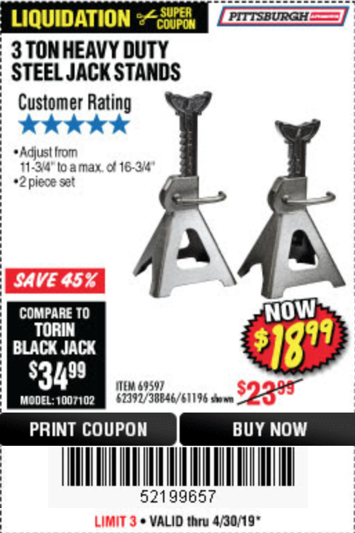 3 TON HEAVY DUTY STEEL JACK STANDS Lot No. 61196/62392/38846/69597 Expired: 3/24/19 - $18.99 Coupon Code: '32731952'