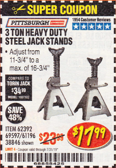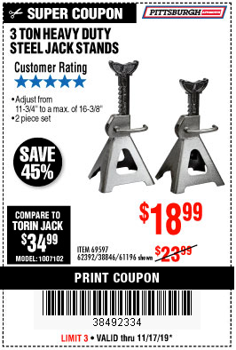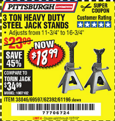 3 TON HEAVY DUTY STEEL JACK STANDS Lot No. 61196/62392/38846/69597 Expired: 4/30/19 - $18.99 Coupon Code: '40650498'