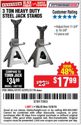 3 TON HEAVY DUTY STEEL JACK STANDS Lot No. 61196/62392/38846/69597 Expired: 12/8/19 - $17.99 Coupon Code: '37817263'