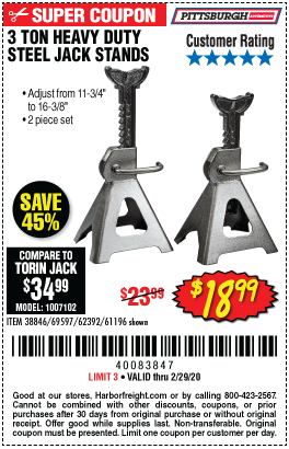 3 TON HEAVY DUTY STEEL JACK STANDS Lot No. 61196/62392/38846/69597 Expired: 3/31/20 - $18.99 Coupon Code: '58462913'