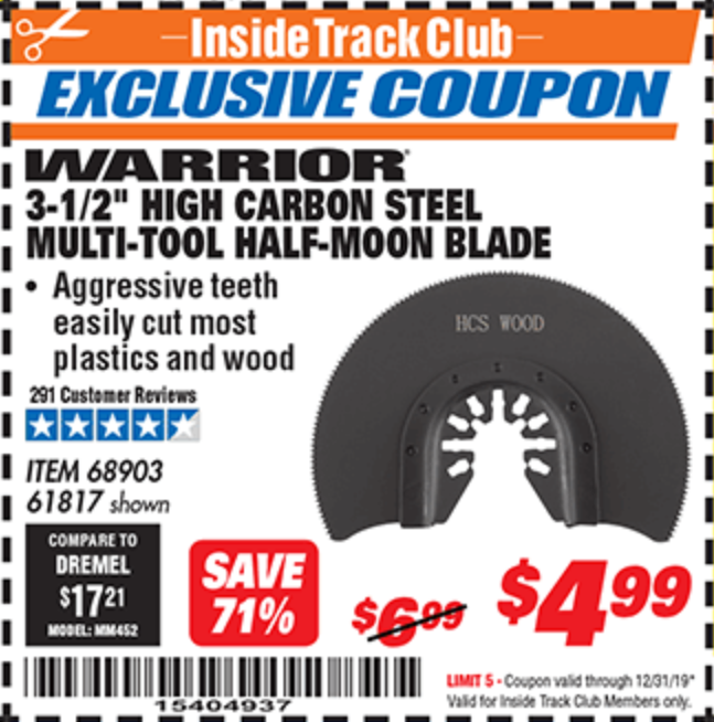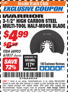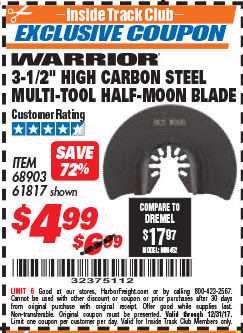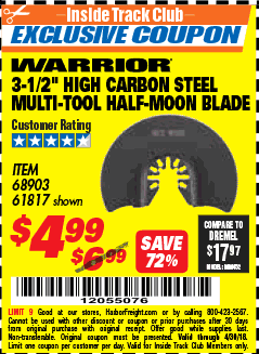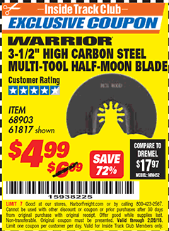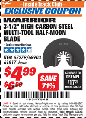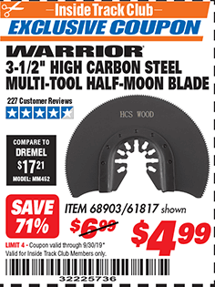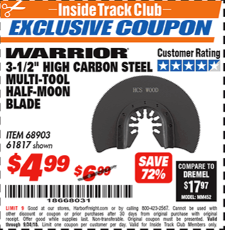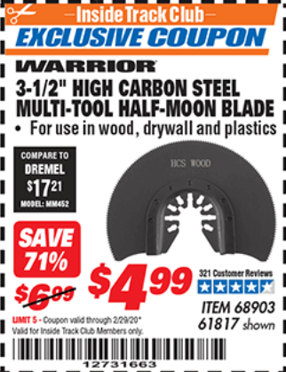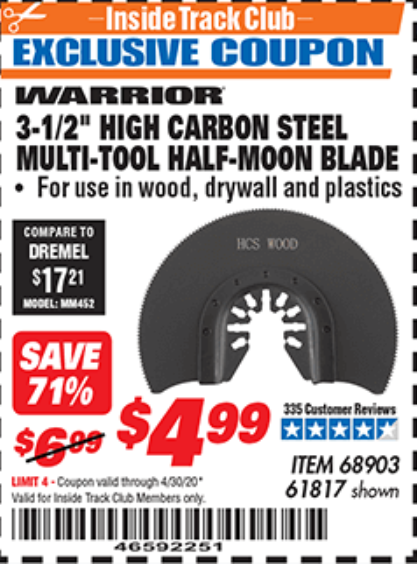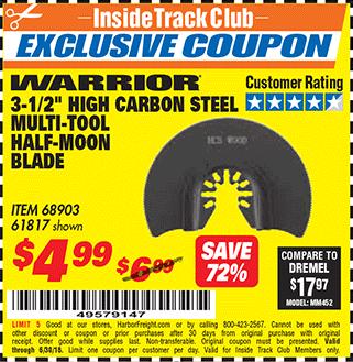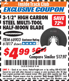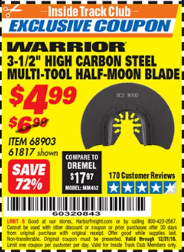 3-1/2" HIGH CARBON STEEL MULTI-TOOL HALF-MOON BLADE Lot No. 61817/68903 Expired: 6/30/15 - $6.99 Coupon Code: '86678167'