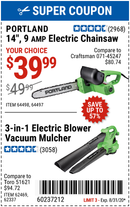 3-IN-1 CORDED ELECTRIC BLOWER VACUUM MULCHER Lot No. 62337/62469 Expired: 8/31/20 - $39.99 Coupon Code: '60237212'