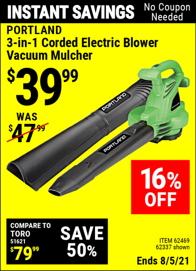 3-IN-1 CORDED ELECTRIC BLOWER VACUUM MULCHER Lot No. 62337/62469 Expired: 8/5/21 - $39.99 Coupon Code: 'n/a'