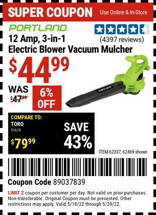 3-IN-1 CORDED ELECTRIC BLOWER VACUUM MULCHER Lot No. 62337/62469 Expired: 5/29/22 - $44.99 Coupon Code: '89037839'