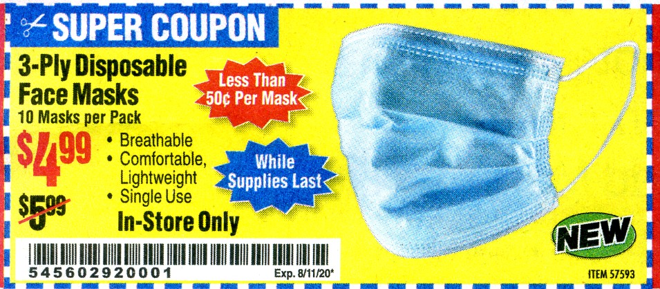 3-PLY DISPOSABLE FACE MASKS, 10-PACK Lot No. 57593/58065 Expired: 8/11/20 - $4.99 Coupon Code: '54560292'