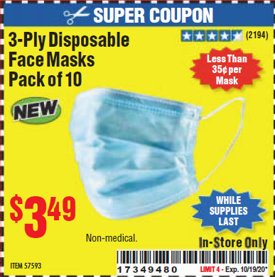 3-PLY DISPOSABLE FACE MASKS, 10-PACK Lot No. 57593/58065 Expired: 10/19/20 - $3.49 Coupon Code: '17349480'