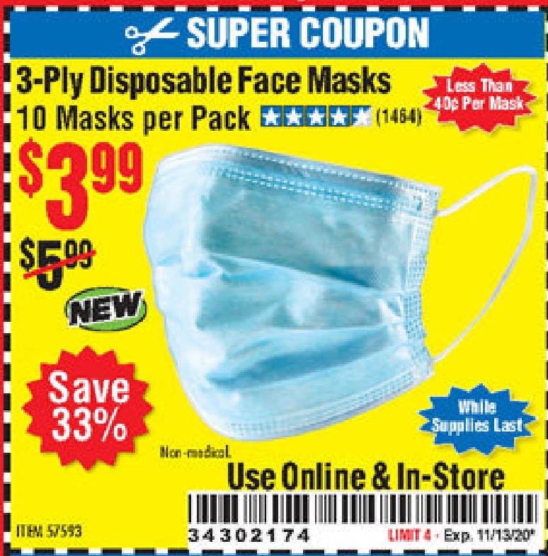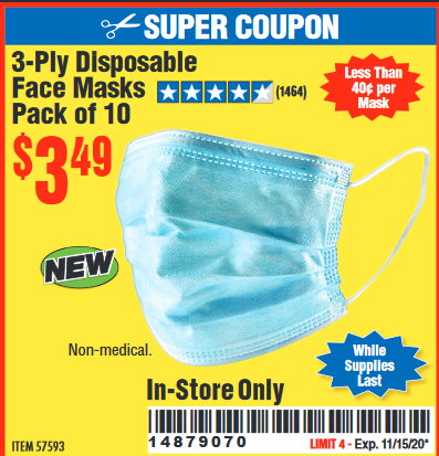 3-PLY DISPOSABLE FACE MASKS, 10-PACK Lot No. 57593/58065 Expired: 11/13/20 - $3.99 Coupon Code: '34302174'