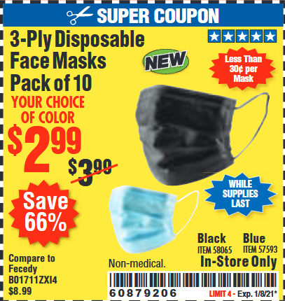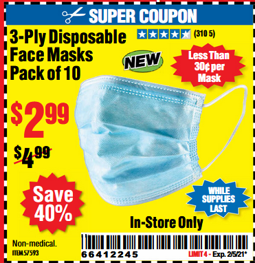 3-PLY DISPOSABLE FACE MASKS, 10-PACK Lot No. 57593/58065 Expired: 2/5/21 - $2.99 Coupon Code: '66412245'