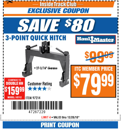 ITC 3-POINT QUICK HITCH Lot No. 97214 Expired: 12/26/18 - $79.99 Coupon Code: '47267229'