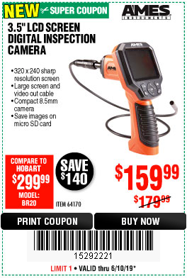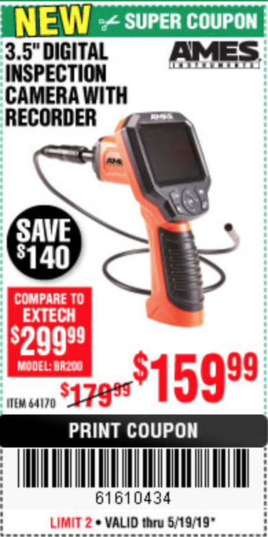 3.5" DIGITAL INSPECTION CAMERA WITH RECORDER Lot No. 64170 Expired: 5/19/19 - $159.99 Coupon Code: '61610434'