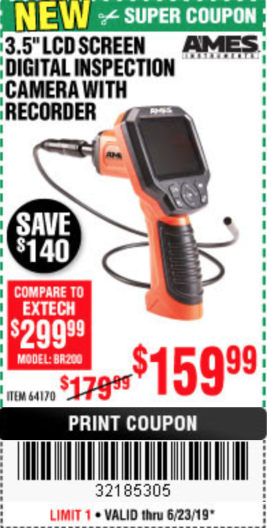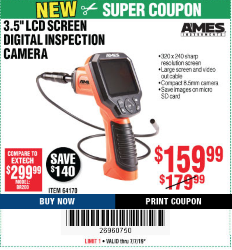 3.5" DIGITAL INSPECTION CAMERA WITH RECORDER Lot No. 64170 Expired: 7/7/19 - $159.99 Coupon Code: '26960750'