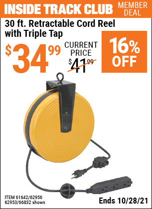 ITC 30 FT. RETRACTABLE CORD REEL WITH TRIPLE TAP Lot No. 61642/62956/62953/66832 Expired: 10/28/21 - $34.99 Coupon Code: 'n/a'