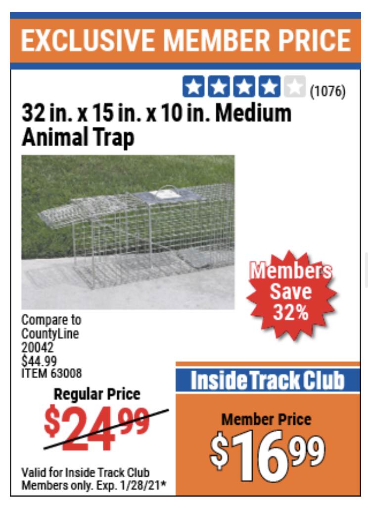 ITC 32 IN. X 15 IN. X 10 IN. MEDIUM ANIMAL TRAP Lot No. 63008 Expired: 1/28/21 - $16.99 Coupon Code: 'n/a'