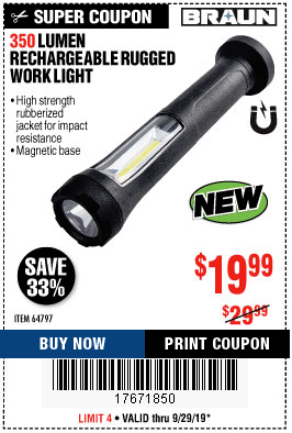350 LUMEN RECHARGEABLE RUGGED WORK LIGHT Lot No. 64797 Expired: 9/29/19 - $19.99 Coupon Code: '17671850'