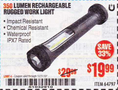 350 LUMEN RECHARGEABLE RUGGED WORK LIGHT Lot No. 64797 Expired: 10/31/19 - $19.99 Coupon Code: '51032910'