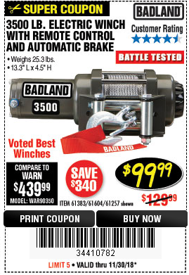 3500 LB. ELECTRIC WINCH WITH REMOTE CONTROL AND AUTOMATIC BRAKE Lot No. 61383/61604/61257 Expired: 3/11/18 - $109.99 Coupon Code: '18513450'