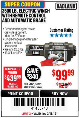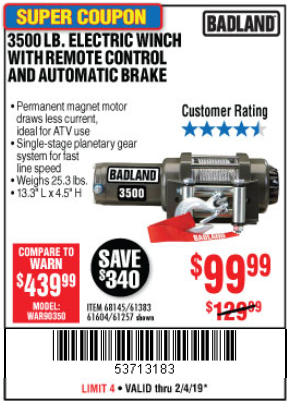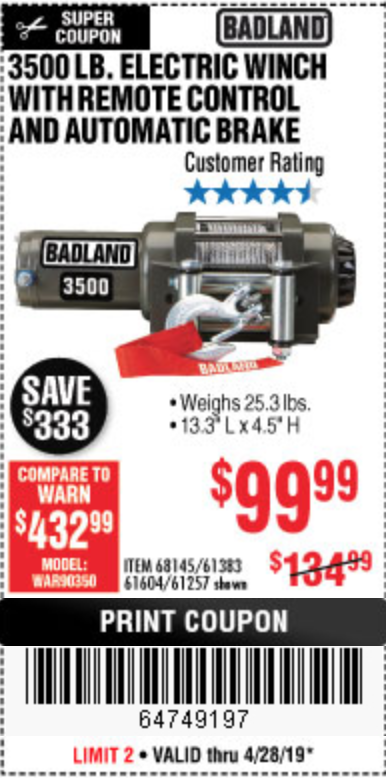 3500 LB. ELECTRIC WINCH WITH REMOTE CONTROL AND AUTOMATIC BRAKE Lot No. 61383/61604/61257 Expired: 3/31/19 - $99.99 Coupon Code: '19766006'